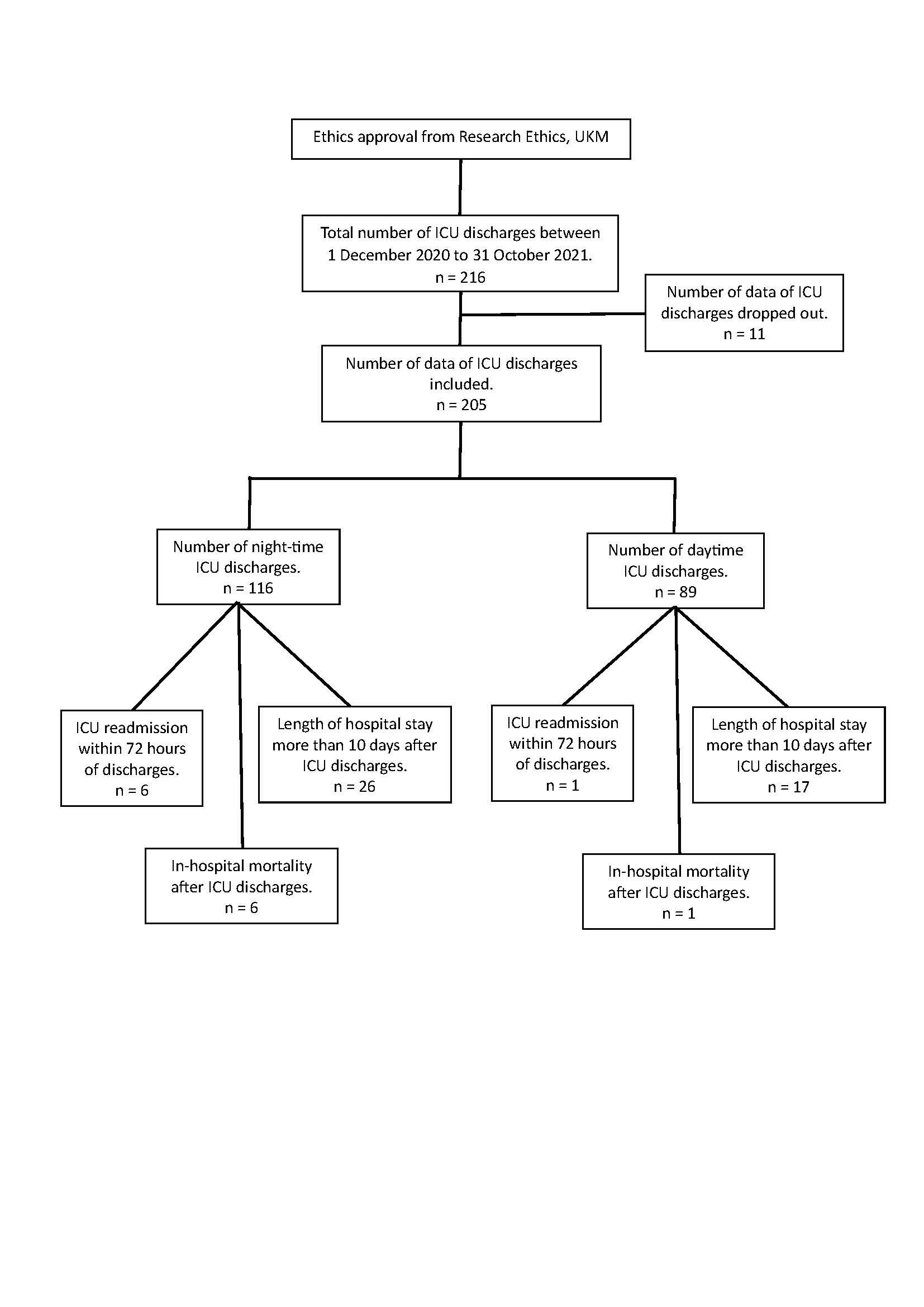 Kajian prospektif ini menentukan prevalens discaj dari unit rawatan rapi (ICU) pada waktu malam, membandingkan kesan kepada pesakit apabila didiscaj dari ICU pada waktu malam serta waktu siang dan mengenal pasti faktor yang mempengaruhi kesan kepada pesakit. Kajian ini melibatkan pesakit yang didiscaj hidup dari ICU dan mengecualikan mereka yang dikeluarkan perintah jangan-resusitasi atau dimasukkan semula ke ICU selepas 72 jam setelah keluar dari ICU. Pesakit dikumpulkan ke dalam kumpulan discaj waktu malam yang berlaku di antara pukul 1700 dan 0759 keesokan harinya atau kumpulan discaj siang hari yang berlaku antara pukul 0800 dan 1659 pada hari yang sama. Kadar kemasukan semula ke ICU, tempoh tinggal di hospital melebihi 10 hari setelah discaj dari ICU, dan kadar kematian yang berlaku d hospital telah dibandingkan. Data 205 pesakit telah dianalisis dan 116 pesakit (56.6%) telah di discaj pada waktu malam. Kesan kepada pesakit adalah setanding apabila perbandingan dibuat antara waktu discaj dari ICU. Antara pesakit yang didiscaj pada waktu malam, kadar kemasukan semula terjejas dengan ketara oleh ketersediaan penjagaan susulan selepas ICU (p=0.002); kadar tempoh tinggal di hospital lebih dari 10 hari setelah discaj ICU terkesan secara ketara dengan keperluan mobilisasi katil untuk menampung kemasukan akut ICU (p=0.021); kadar kematian di hospital berkaitan secara ketara dengan sumber jangkitan yang tidak dikawal (p=0.004), keperluan untuk mobilisasi katil (p=0.001) dan ketersediaan penjagaan susulan selepas ICU (p=0.01). Kesimpulannya, masa discaj dari ICU tidak menjejaskan kesan kepada pesakit ketika berada di hospital.